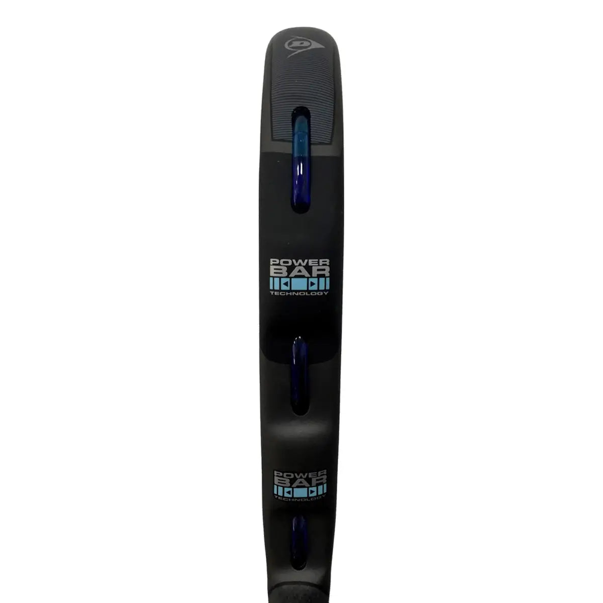 El diseño de esta pala combina un acabado mate en gris y negro, con detalles azules que refuerzan su estilo competitivo y profesional. El logotipo de Dunlop está centrado en las caras, mientras que el nombre del modelo se presenta sobre el puente, aportando un aire técnico y sobrio.
