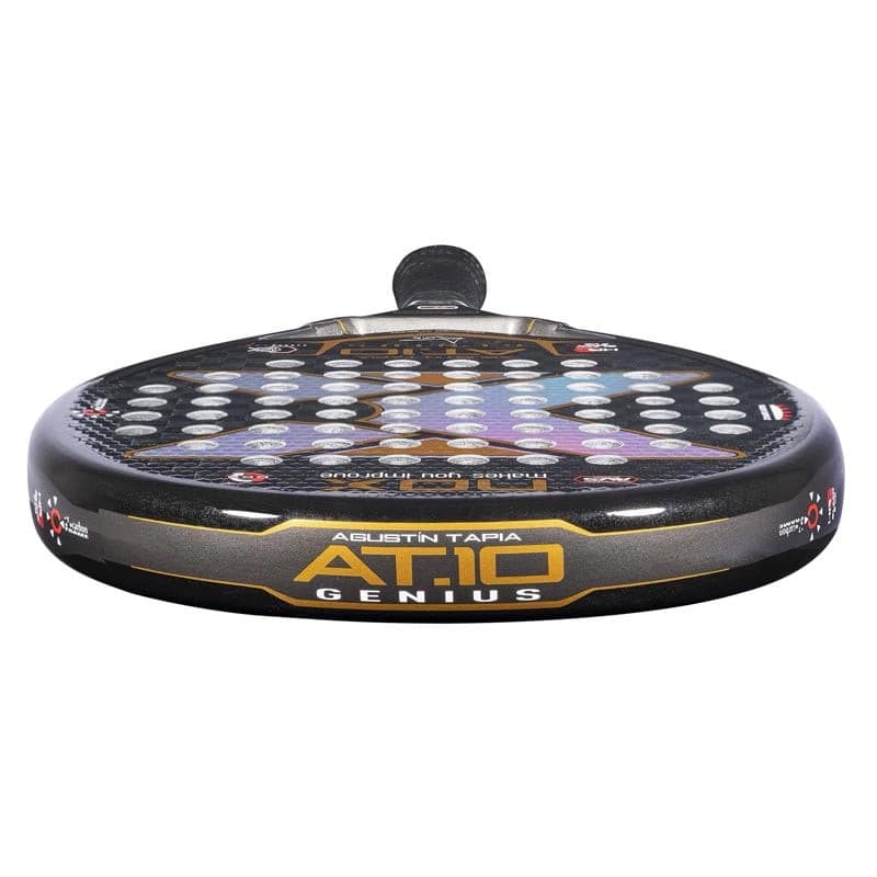 La pala de pádel Nox AT10 Genius Hard Agustín Tapia 2022 ha sido fabricada para perfeccionar el control del golpeo gracias a una equilibrada distribución del peso, la inclusión de un amplio número de perforaciones y al empleo de materiales muy ligeros.