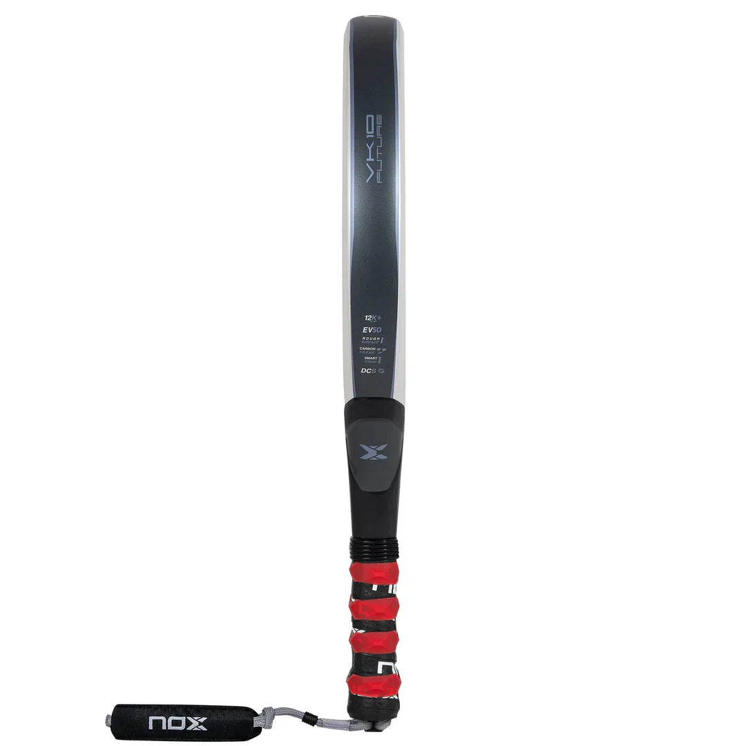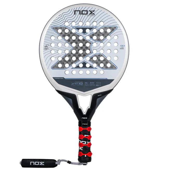 La nueva VK10 mantiene aspectos de su predecesora como el formato redondo y la goma EV50 de alta reactividad para controlar el juego desde el fondo de la pista pero presenta como novedad un acabado en Fibra de Carbono Aluminizado 12K para un tacto confortable y sólido.
