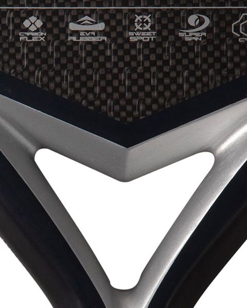 Tiene un marco fabricado con un 80% de fibra de carbono y un 20% de fibra de vidrio japonesa trenzada, para dar más suavidad y flexibilidad a la pala. Los planos están hechos de fibra de carbono 3K aluminizada torcida a 45 grados, para reducir las posibles vibraciones. El acabado rugoso RS 3D te permitirá darle mejor efecto a la pelota.