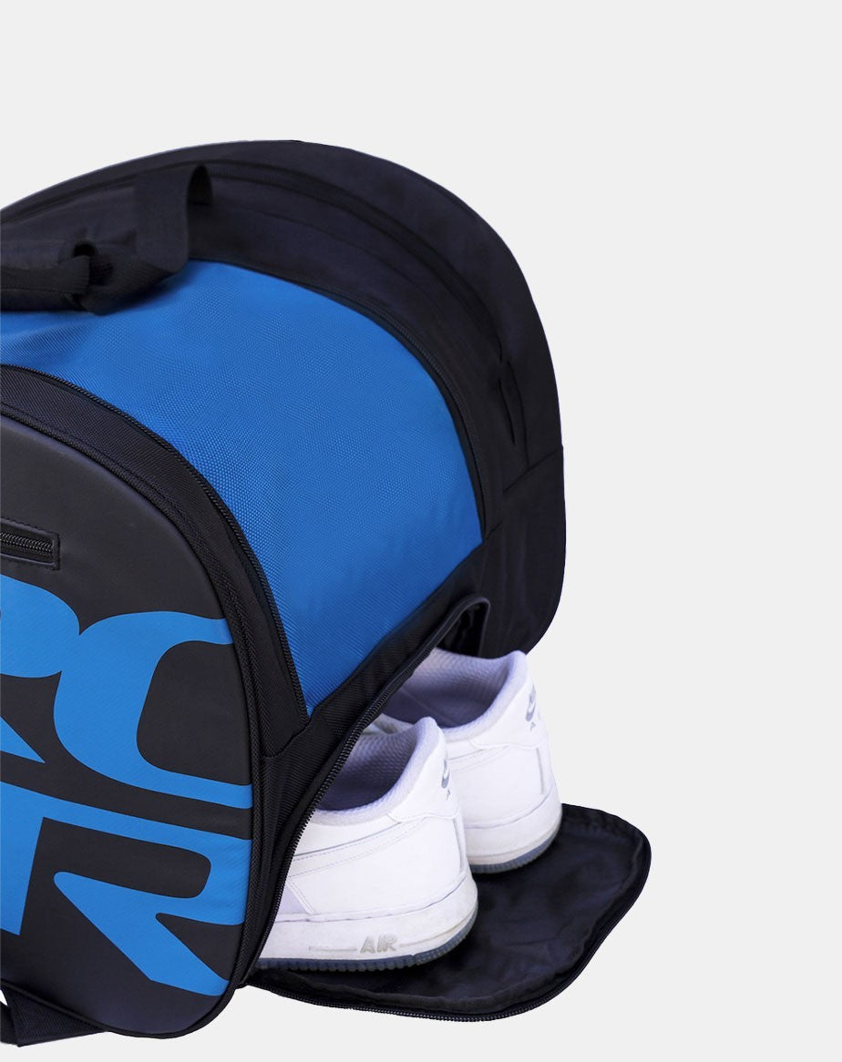 La parte inferior del bolso incluye una bolsa ventilada integrada para zapatillas, separando el calzado del resto del contenido. También incorpora un pequeño bolsillo frontal para objetos personales como tarjetas o accesorios, y un bolsillo superior trasero pensado para llaves y cartera, aportando comodidad y practicidad.